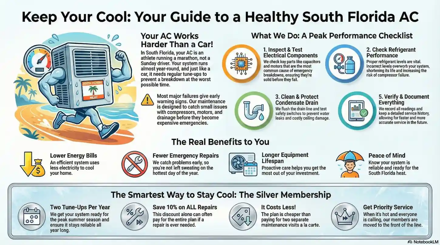 While we are always here for your urgent AC repair needs in Kendall, we also believe in helping homeowners prevent breakdowns. Regular preventive maintenance is key to keeping your system running smoothly, efficiently, and reliably throughout the year. Addressing minor issues during routine service can prevent them from becoming major, costly repairs down the road. Consider our Maintenance Plan to keep your system in peak condition and potentially extend its lifespan.